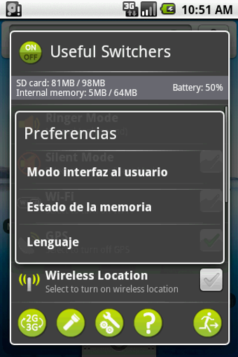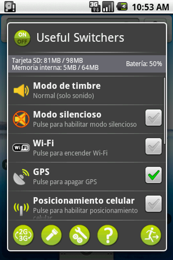 Los ajustes de Useful Switchers vienen agrupados en dos pantallas. En la primera encontrarás los relacionados con la red y la segunda los que tengan que ver con perfiles, GPS, Bluetooth, sincronización y WiFi, entre otros.